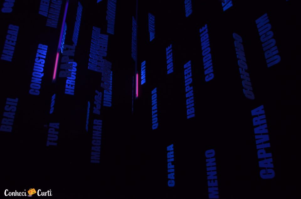 O museu é interativo, em uma das salas podíamos experimentar tocar música com nossos movimentos. Em outra sala, havia havia uma coisa curiosa, eram palavras usadas no português do Brasil penduradas no teto. Mais adiante tínhamos frutas e produtos típicos do Brasil.