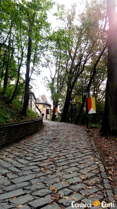 As visitas são pagas e em horários pré-determinados. Como o castelo é sobre uma colina, tem que subir esse trecho a pé. Depois que subimos um pedaço é que descobrimos que a compra dos ingressos é no início, antes de subir. É lá também que dá para pegar o folder com as informações sobre o Castelo de Orava. Voltamos para comprar as entradas e volta a subir tudo de novo. Cheguei lá em cima de língua de fora!