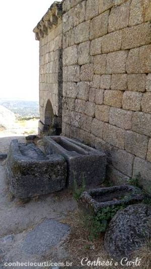 Enfim chegamos ao Castelo de Monsanto. Meu marido e eu sentamos para tomar um fôlego e nossas filhas foram andar sobre as muralhas. Nessa foto é possível observar a Capela de São Miguel no lado externo, fora das muralhas do Castelo.