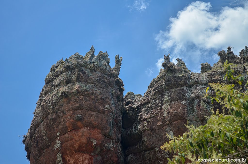 O guia nos contou que a fauna é muito rica nesta área de preservação. Que há lobo-guará, bugio, jaguatirica, quatis, diversas espécies de aves e cobras! Sim, há cobras e entre elas cascavel, jararaca e a cobra cipó. As cobras, segundo o guia, ficam nas pedras e mais na região onde há mata, sendo muito difícil encontrar alguma cobra na trilha. Não encontramos nenhuma, ainda bem! 🙂 Logo depois da taça avistamos um pequeno esquilo no meio das plantas e conseguimos ver um pássaro, que segundo nosso guia, era um jacu.